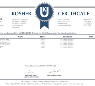 Esta certificación verifica que los ingredientes, el proceso de producción, incluida toda la maquinaria, y/o el proceso de servicio de alimentos cumplan con los estándares de kashrut estipulados en el Shulján Arukh.